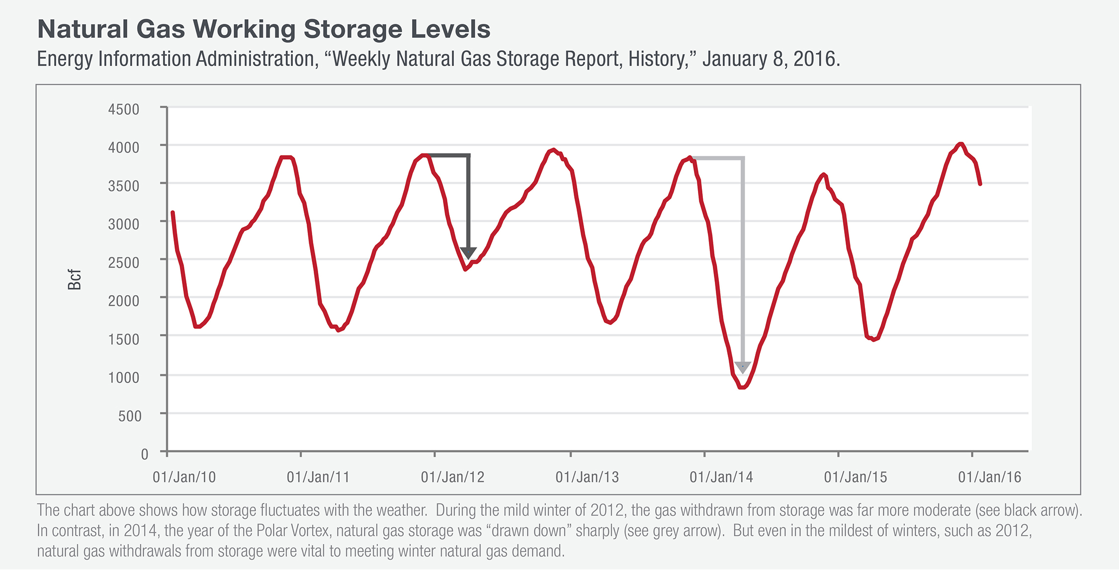 Put simply, when natural gas production is higher than natural gas consumption (typically April through October), it can be placed into storage. When natural gas production is lower than consumption (November through March), it can be withdrawn from storage to meet demand. In fact, about 20 percent of all natural gas consumed each winter comes from underground storage. Storage can also be used to keep natural gas flowing to customers in the event of temporary disruptions in production and also helps interstate pipeline companies balance system supply on their long-haul transmission lines. The flexibility and resiliency provided by storage is the key to maintaining reliable and responsive natural gas delivery.