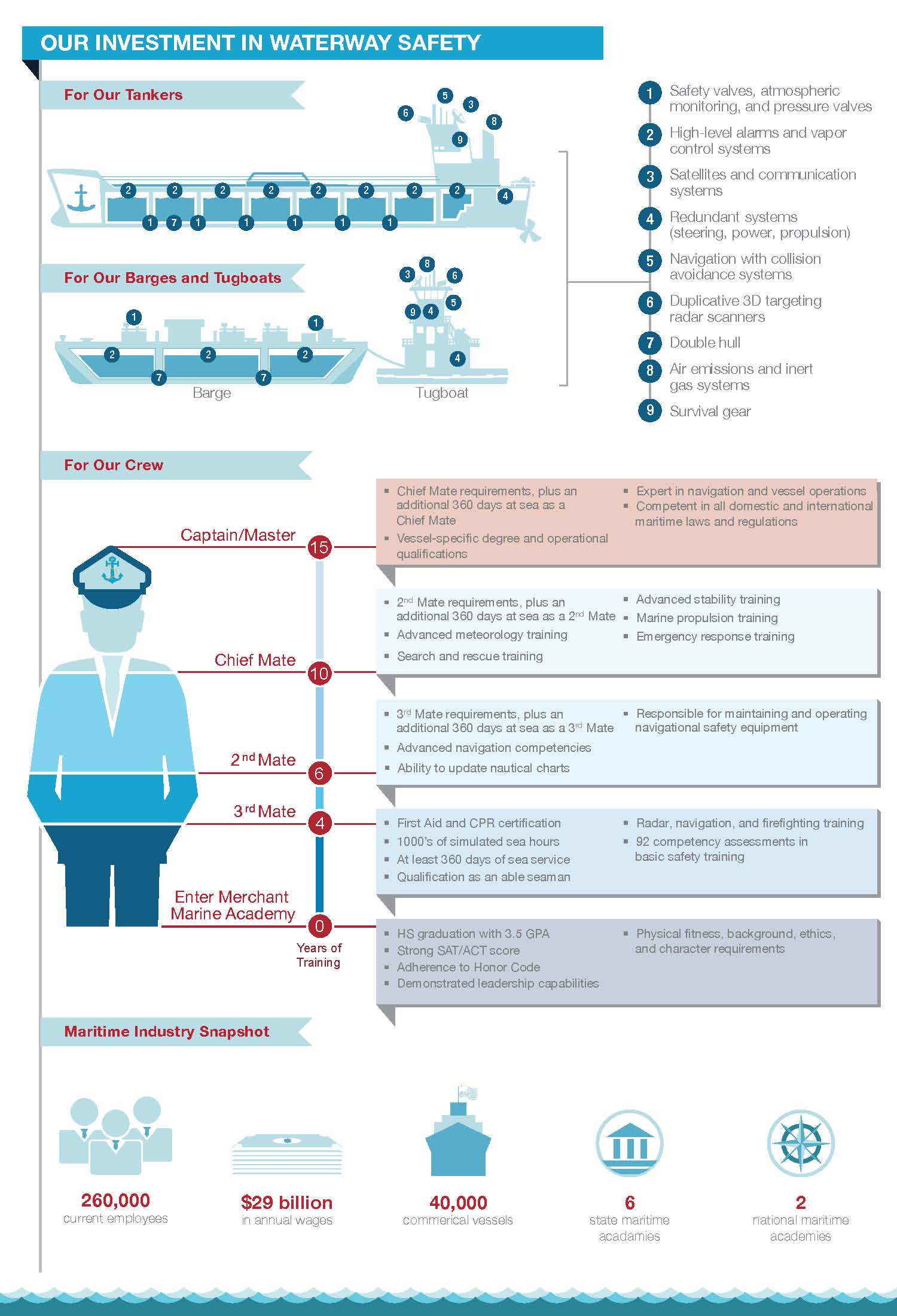 Maritime transportation is also an extremely safe mode of transport. Since 1970, there has been a 98% reduction in oil spilled from tankers worldwide. This is due to the safety features of the vessels and the training of the crew.