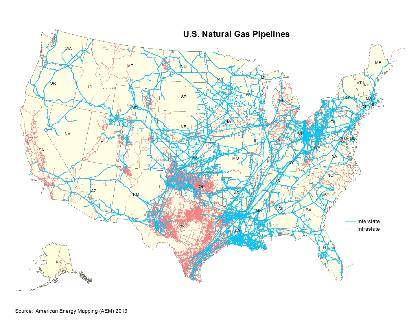 In 2013, there was approximately 320,000 miles of gas transmission and gathering piping. This mileage divides into 298,306 miles of on-shore transmission piping, 4,520 miles of off-shore transmission piping, 11,307 miles of on-shore gathering piping, and 6,128 miles of off-shore gathering piping. Natural gas transmission piping can be interstate or intrastate, and it moves the product from a gathering line or storage location to a distribution point or another storage location. There is both on-shore and off-shore transmission piping. Gathering piping moves the product from the production facility to a transmission line, and it can also be on-shore or off-shore. These definitions are also similar for liquids pipelines.