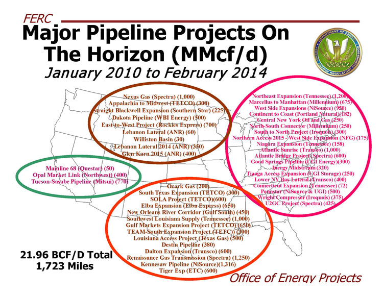 As evident from the information above, there are numerous natural gas pipeline projects projected. These pipelines will play a critical role, as there is a projected trend for the US to consume 30% more natural gas, either in residences or natural gas power plants, between 2014 and 2025. Also, if LNG exports are allowed, this infrastructure will move products from the producing areas to the LNG facilities and terminals.